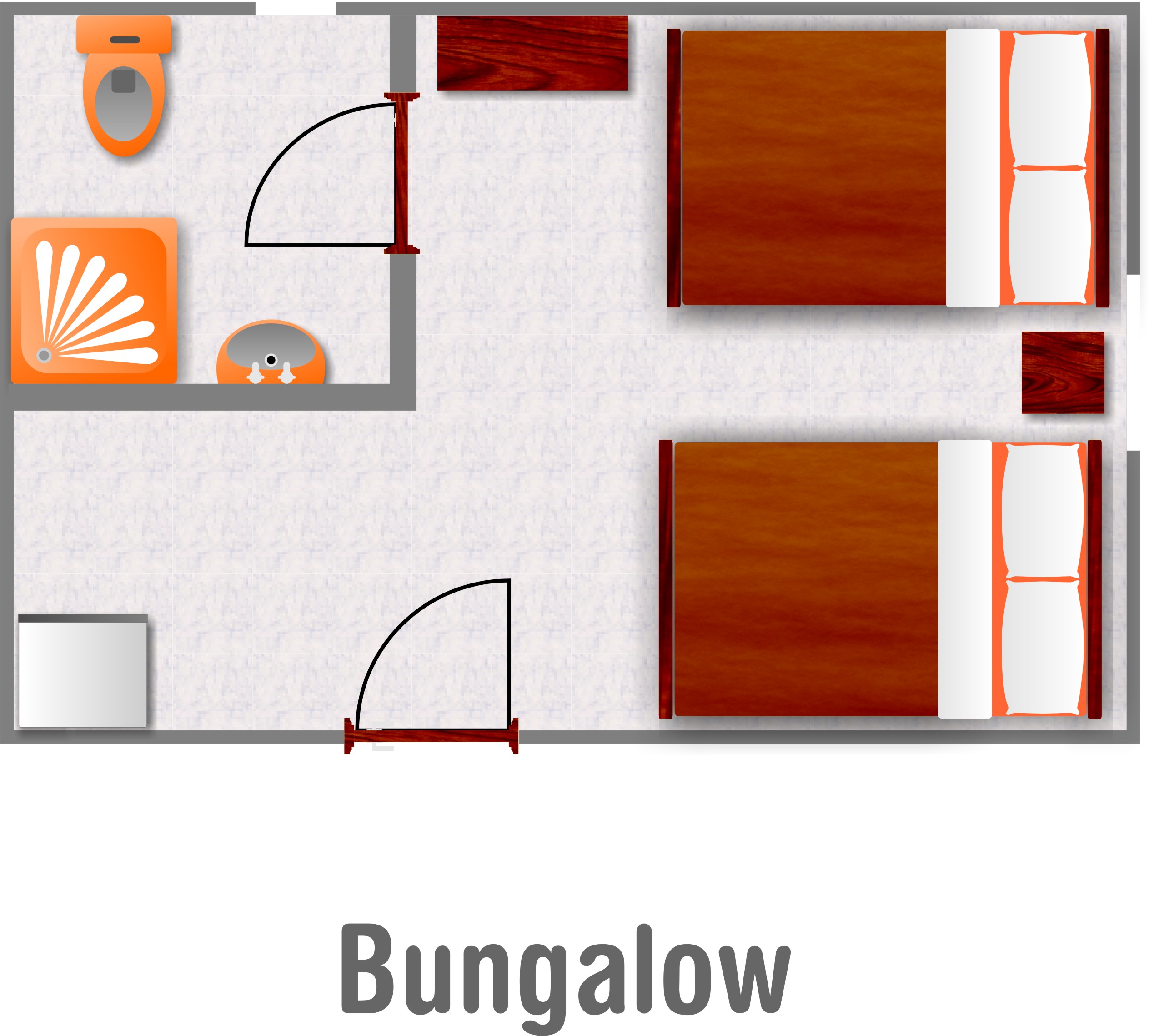 The Bungalows are 15m² ground-floor rooms, featuring two 1.40m beds, a WC, shower, refrigerator, wardrobe, and air conditioning.