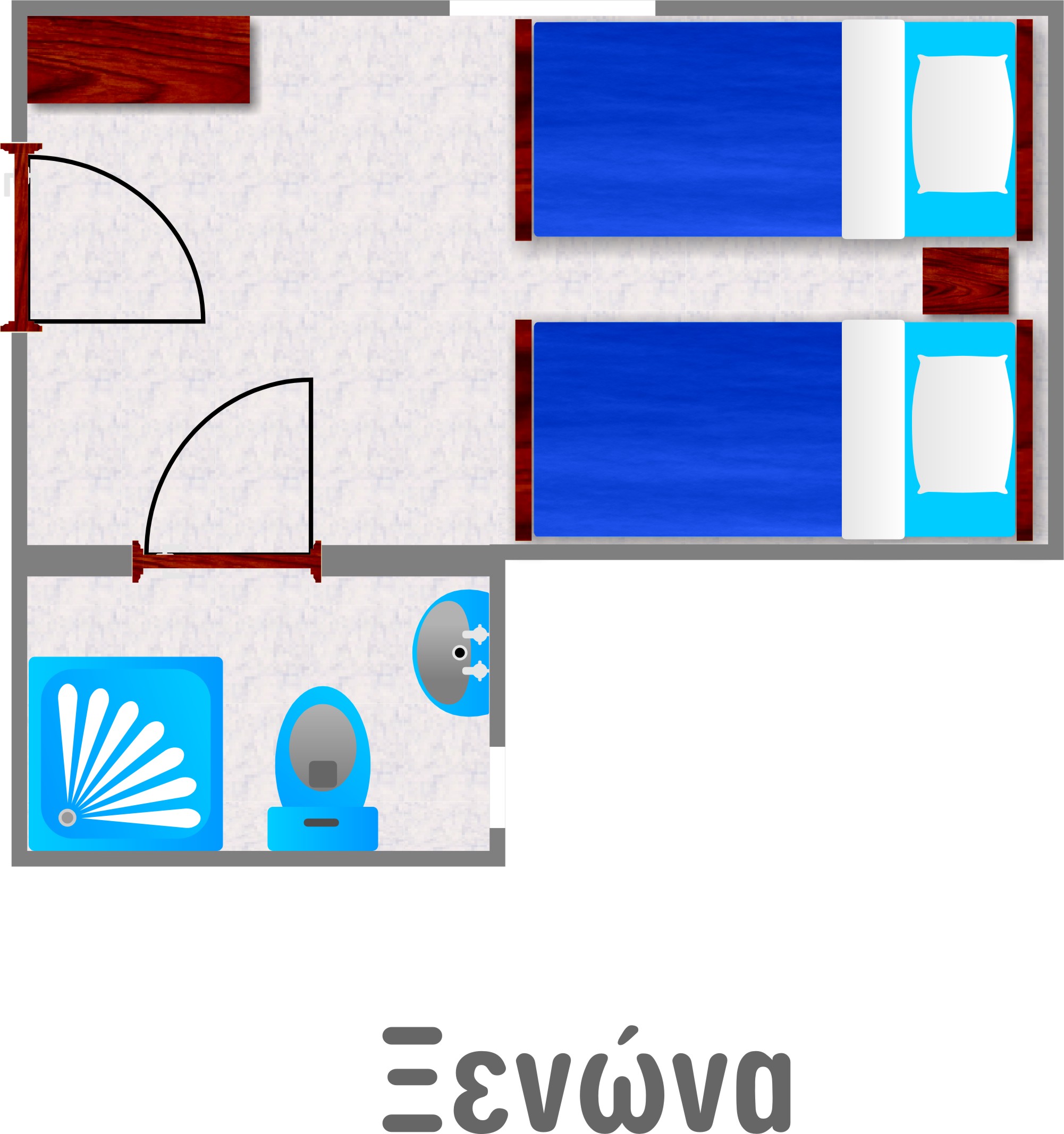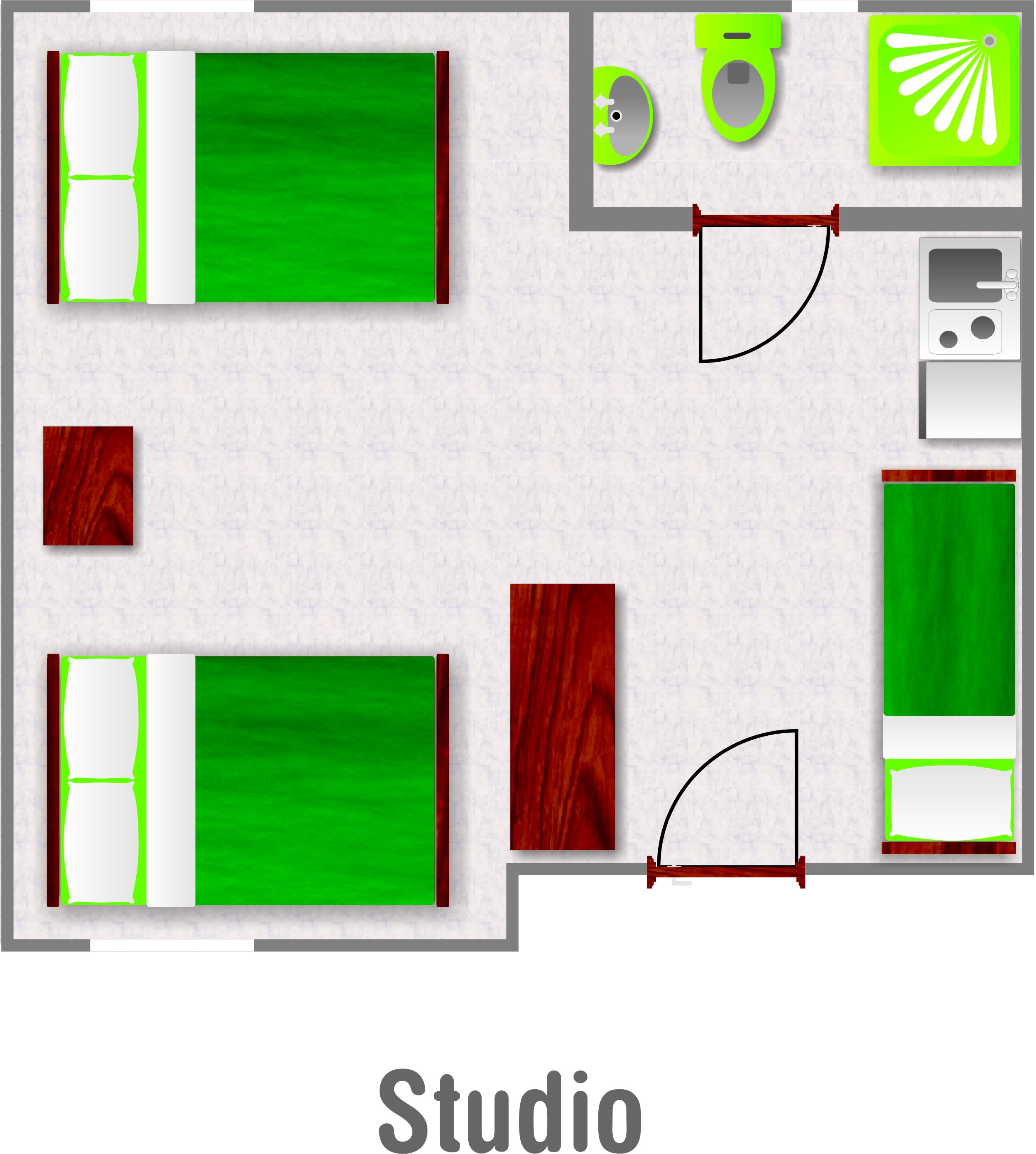 The Studios are ground-floor rooms of 24 sq.m. and include two double beds and a small single sofa bed. They feature a table and chairs for the outdoor area. They can accommodate up to 4 adults & 1 child. In addition to a fridge, wardrobe, and air conditioning, they also have a kitchenette for use with your own utensils, making them ideal for your family!